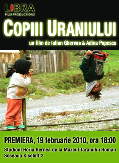 Dragi vizitatori ai FILMETARI şi cinefili de pretutindeni, am plăcerea de a vă anunţa că vineri, 19 februarie 2010, va avea loc premiera oficială a filmului documentar “Copiii Uraniului“. Filmul, câştigător al premiului pentru “Cea mai bună cercetare într-un film românesc” la ediţia 2009 a Festivalului Internaţional de Film Documentar ASTRA de la Sibiu, spune povestea unei aşezării miniere Băiţa Plai din judeţul Bihor. Aceasta fost ridicată în anii ’50 după descoperirea de către ruşi a unui bogat zăcământ uranifer. În scurt timp au început exploatarea masivă a minereului. Scopul principal: sprijinirea programului nuclear militar sovietic. Azi, în aşezarea Băiţa Plai mai trăiesc în prezent aproximativ 90 de oameni. O comunitate mică şi săracă într-un loc ce acum pare devastat de un bombardament atomic. “Copiii Uraniului” a fost realizat de Iulian Ghervas şi Adina Popescu şi produs de către Libra Film, cu sprijinul Centrului Naţional al Cinematografiei şi al Televiziunii Române. Vizionarea va avea loc la Noul Cinematograf al Regizorului Român – Studioul Horia Bernea de la Muzeul Ţăranului Român, vineri, începând cu ora 18.00, în prezenţa realizatorilor şi a producătorului Tudor Giurgiu.
